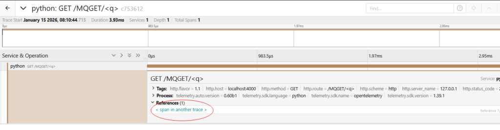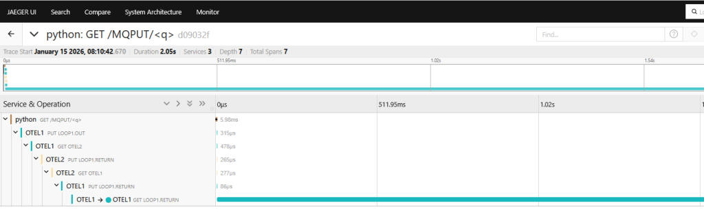 The implementation in the ibmmq Python library is also automatic. If it can access the OTel libraries via an import, it tries to use them. If the libraries are not available, then no OTel work will be attempted. There is also an MQIPY_NOOTEL environment variable to disable the MQ interception and processing even if the OTel libraries are available.